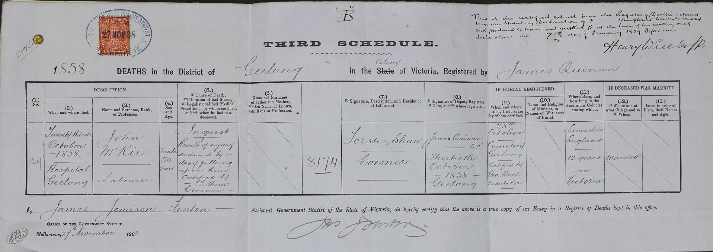 VPRS 460 at PROV contains the details and background documents.  At the beginning of this blog is an image of a death certificate.  Why?  In VPRS 460, together with a Statutory Declaration they were evidence as to why the family of the late John MACKEN / McKIE had no claim to the land.  In fact the Stat Dec gave amazing details of John MACKEN’s life and work on the property in question.